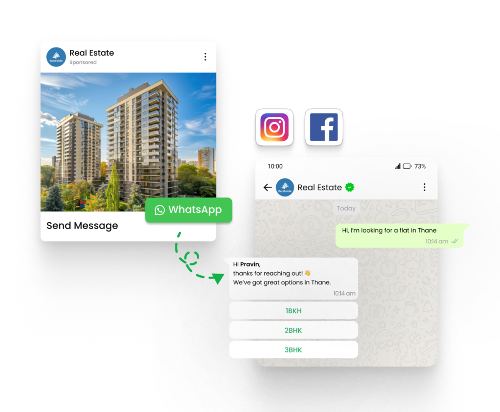 Drive instant conversations from Facebook & Instagram ads to WhatsApp.Run Ads on Facebook & Instagram that land on WhatsApp. 5X Your lead generations & 2-3X Conversions Instantly! Reduce drop-offs by letting customers message you in one tap instead of filling forms.
